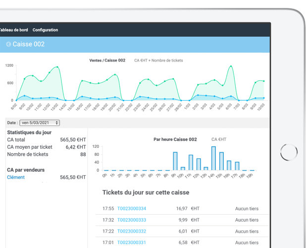 Consultez vos statistiques de vente, en temps réel, par caisse, par jour, par mois, par vendeur. Editez vos Z et transférez simplement les données à votre expert-comptable.